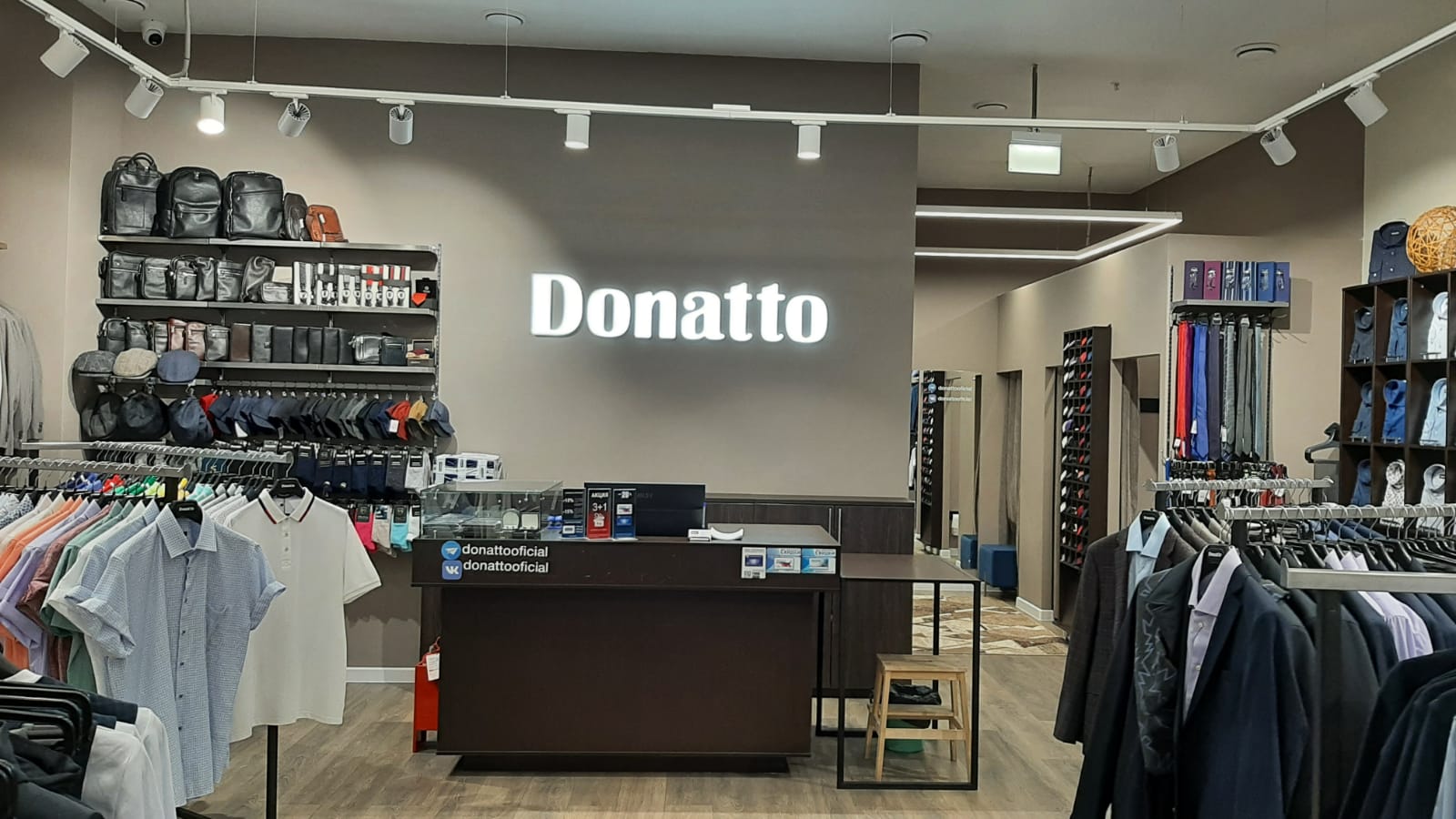 Помещение площадью 110 м² оформлено в лаконичной дизайн – концепции, в трендовых цветовых тонах. Изменилась входная группа и уровень его освещенности. Фактура отделки магазина, элементы его интерьера, светильники и современное торговое оборудование гармонично сочетаются с представленным ассортиментом. В коллекциях «Donatto» – базовые и ультрамодные модели верхней мужской одежды, классические костюмы, пиджаки, брюки, рубашки, трикотаж и аксессуары в ценовом сегменте «средний» и «средний +».